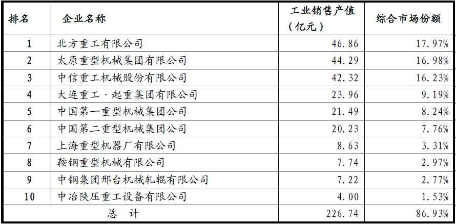 根据中国机械行业协会统计,截至2012年4月末,国内重型机械行业规模以上企业共3,714家,其中规模较大的主要包括中国第一重型机械集团公司、中国第二重型机械集团公司、大连重工起重集团有限公司、北方重工集团有限公司、太原重型机械集团有限公司、中信重工机械股份有限公司、上海重型机械厂有限公司等。世界上较大的重型机械企业主要包括全球三大知名冶金设备制造商德国的西马克集团、西门子奥钢联和总部位于意大利的达涅利集团、韩国最大的发电设备制造商斗山重工、世界知名的综合机械设备制造商三菱重工等,他们的产品线丰富,从炼钢、铸锻件到设计制造发电设备、冶金设备、水泥设备、起重设备,并承建工程项目,其技术水平、工艺装备以及规模明显强于中国主要重型机械企业。