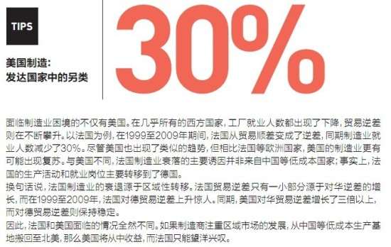 一般以为,美国制造业的衰退始于上世纪70年代末,当时,日本的汽车厂商和电子产品制造商在设计、质量、效率和本钱等方面一举超越美国。但若仔细研究1980至2010年的数据,我们会有新的发现。在上世纪80和90年代,尽管汽车和纺织等行业面临困境,但美国制造业总体发展良好,就业情况也保持稳定。在1980至2000年,生产类工作岗位的数目每年仅减少0.5%;同时,美国占全球制造业产值的比重超过了德国和日本。