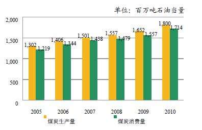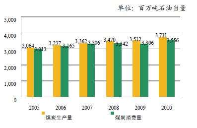 根据《2011年英国石油世界能源统计评论》统计,2010年我国煤炭生产量和消费量分别为1,800.4百万吨石油当量和1,719.8百万吨石油当量,占世界煤炭生产量和消费量的比重分别为48.25%和48.37%。2005年至2010年期间,我国煤炭生产量和消费量持续稳定增长,复合年增长率分别达到6.7%和7.0%。
