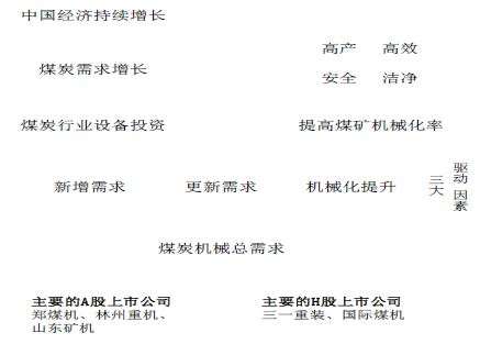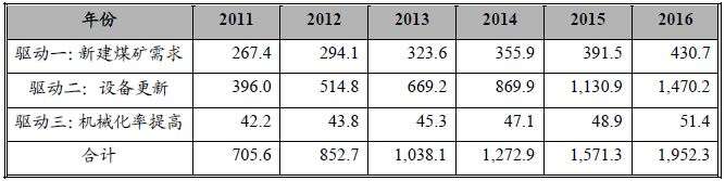 煤炭机械市场需求主要受新开工矿井需求、原有矿井在用设备更新、原有矿井机械化率提高三个因素驱动。