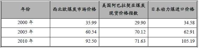 2000年、2005年、2010年国际市场煤炭价格 单位:美元/吨
