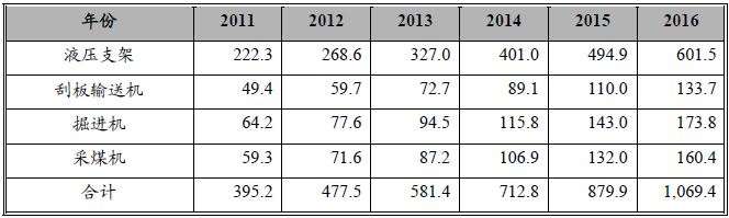 据中国煤炭机械工业协会预测,2016年煤炭机械行业需求将达到1,952亿元,2011-2016年复合年增长率将达到22.6%,市场前景广阔。其中,2016年“三机一架”设备需求将达到1,069亿元。