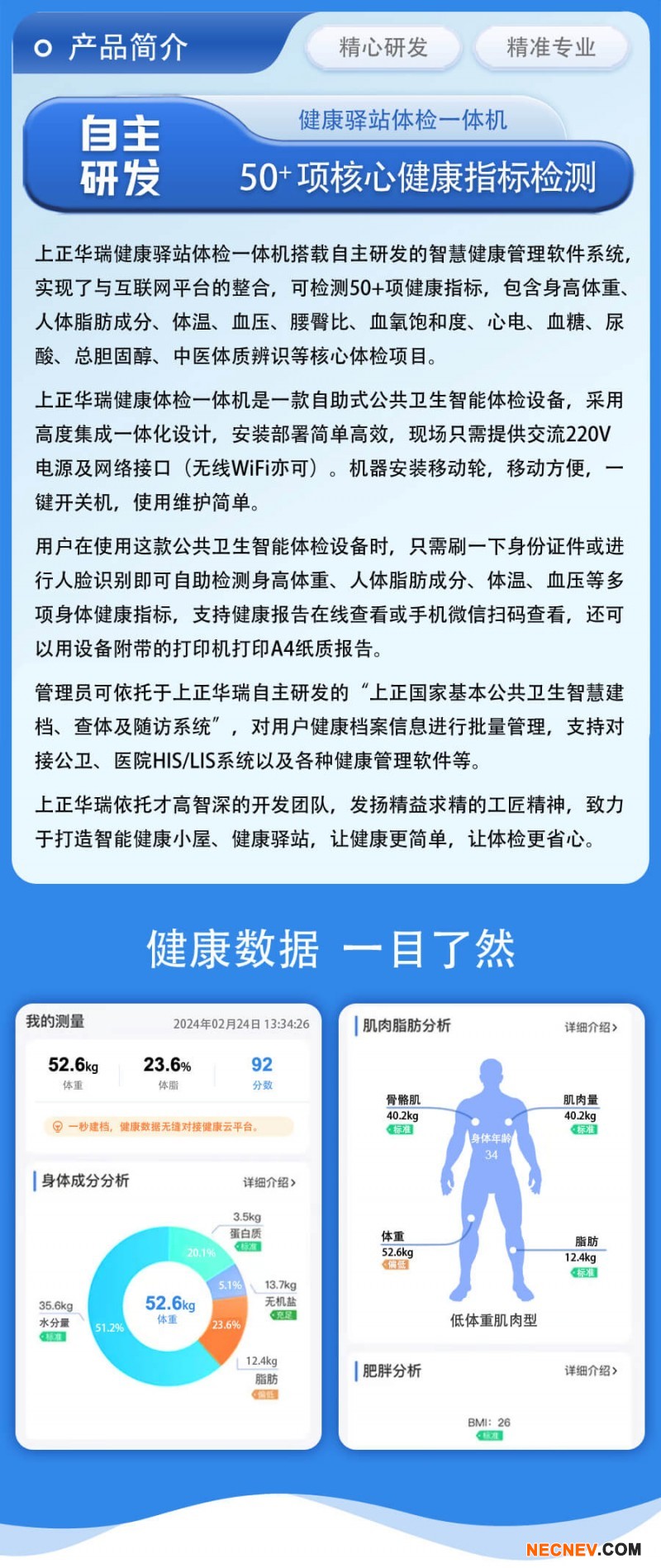 7、提高公共卫生工作效率:传统的健康检查需要到医院或专门的医疗机构进行,而上正华瑞立式健康体检一体机可以在短时间内完成多项检查,大大缩短了检查时间,提高了公共卫生工作的效率。