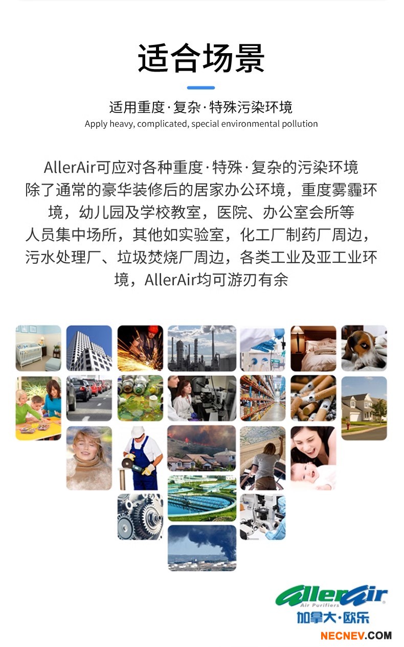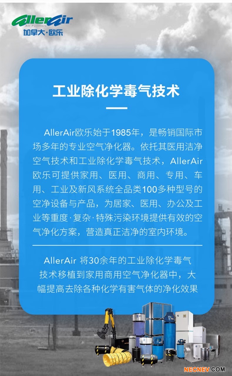 AllerAir欧乐掌握着傲视同侪的洁净空气方面的核心技术和核心产业。作为国际专业空气净化器,AllerAir可提供家用、医用、商用、专用、车用、工业用及新风系统七大类空净设备与产品。其产品线包括防过敏和哮喘、化学毒气治理、预防多种化学物质过敏(MCS)、杀菌除霉、除烟(含火山烟雾)、针对重度雾霾(二氧化硫和氮氧化物)、针对重度装修污染(甲醛、苯、TVOC等)、母婴专用、美容美发与会所用(沙龙系列)、车用、工业及特殊行业专用型、新风系统(管道式)等100多种不同型号的空气净化设备与产品,并已在欧洲、北美等地畅销多年。